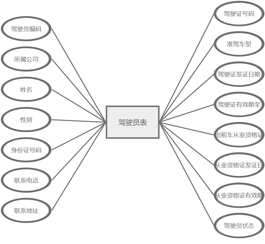 驾驶员管理主要属性包括:驾驶员编码、所属公司、姓名、性别、身份证号码、联系电话、联系地址、驾驶证号码、准驾车型、驾驶证发证日期、驾驶证有效期至、出租车从业资格证号、从业资格证发证日期、从业资格证有效期至、驾驶员状态。