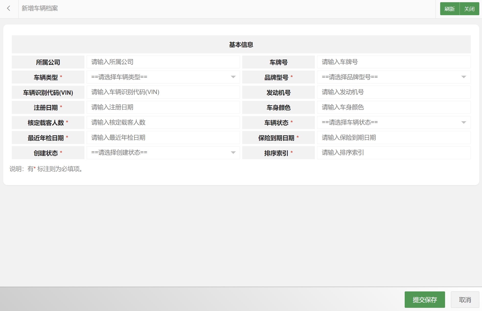 在车辆档案列表中可以选择新增车辆档案、编辑车辆档案、删除车辆档案、搜索车辆档案等。车辆档案属性包括:车辆档案编码、所属公司、车牌号、车辆类型、品牌型号、车辆识别代码(VIN)、发动机号、注册日期、车身颜色、核定载客人数、车辆状态、最近年检日期、保险到期日期等。新增车辆档案界面如图所示:
