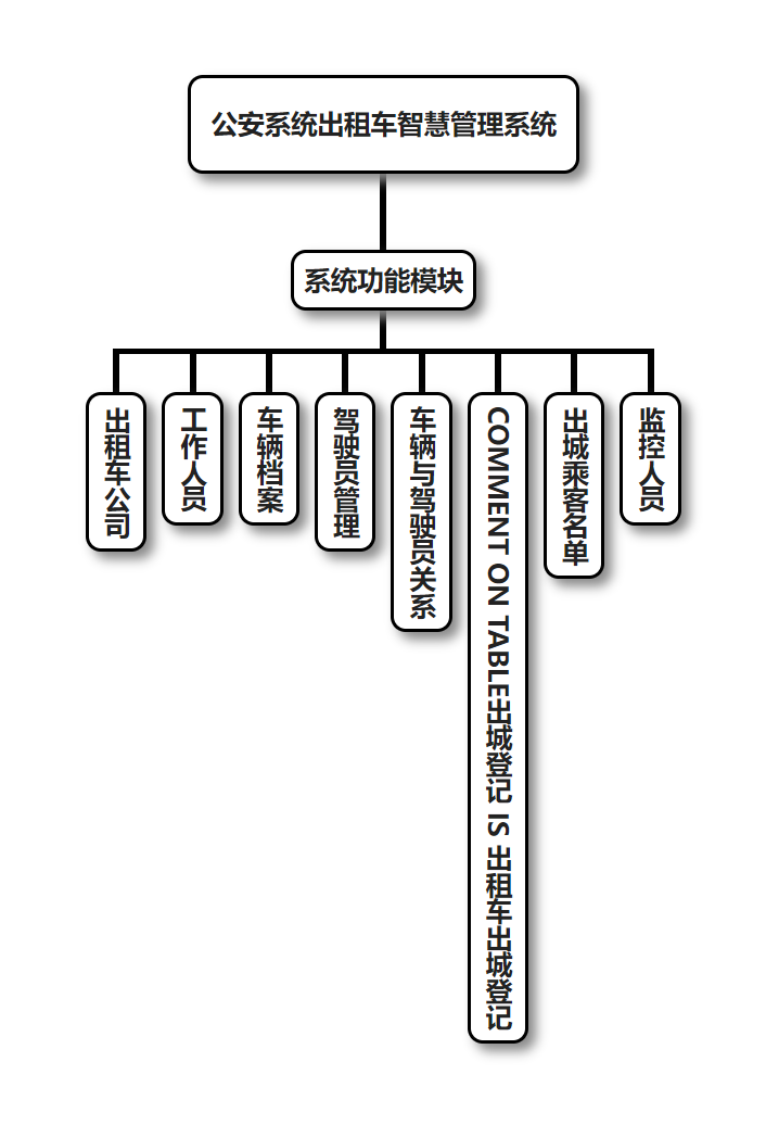 公安系统出租车智慧管理系统的主要功能包括:出租车公司管理、工作人员管理、车辆档案管理、驾驶员管理、车辆与驾驶员关系管理、COMMENT ON TABLE出城登记 IS 出租车出城登记管理、出城乘客名单管理、监控人员管理。