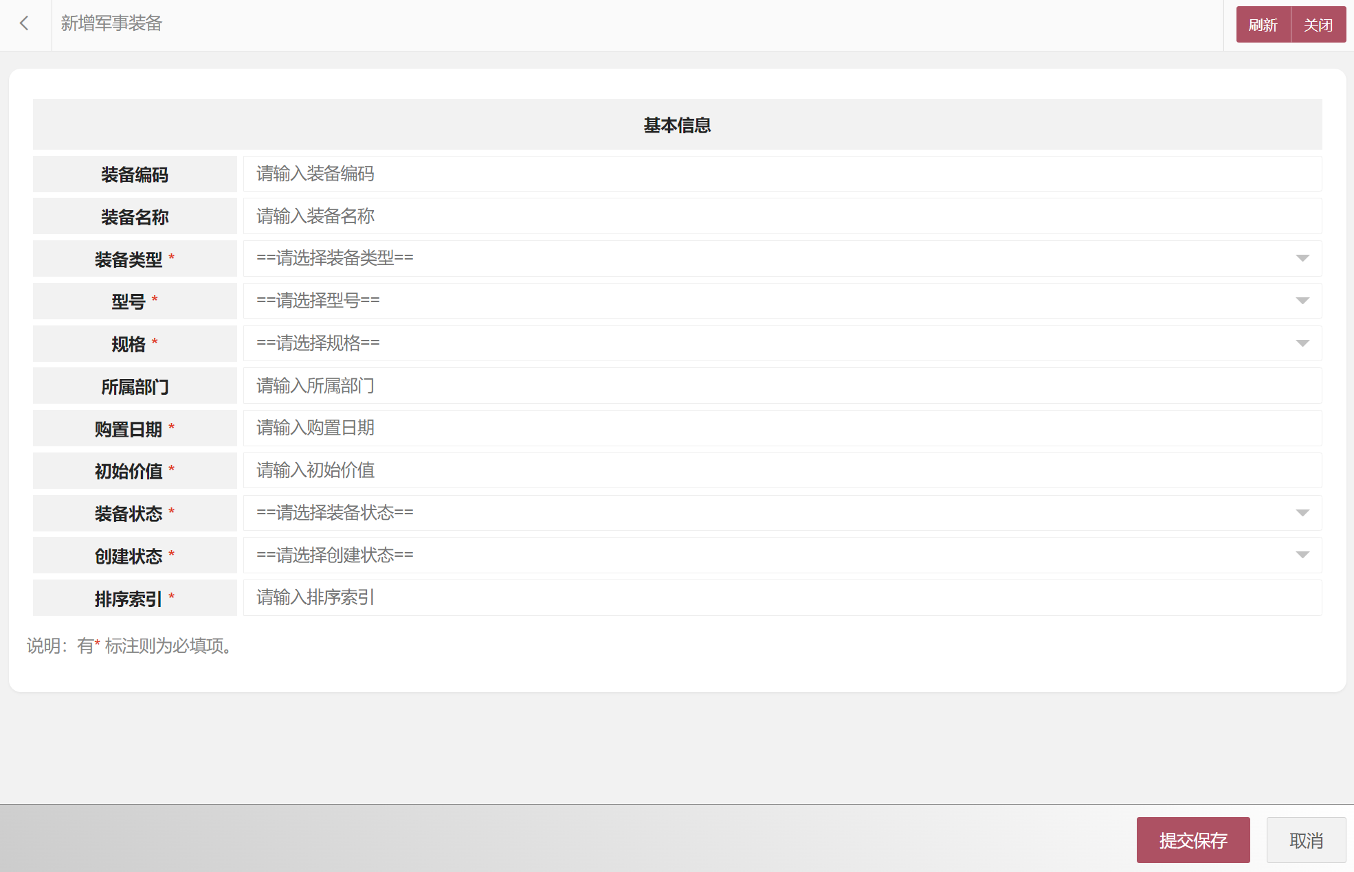在军事装备列表中可以选择新增军事装备、编辑军事装备、删除军事装备、搜索军事装备等。军事装备属性包括:军事装备编码、装备编码、装备名称、装备类型、型号、规格、所属部门、购置日期、初始价值、装备状态等。新增军事装备界面如图所示: