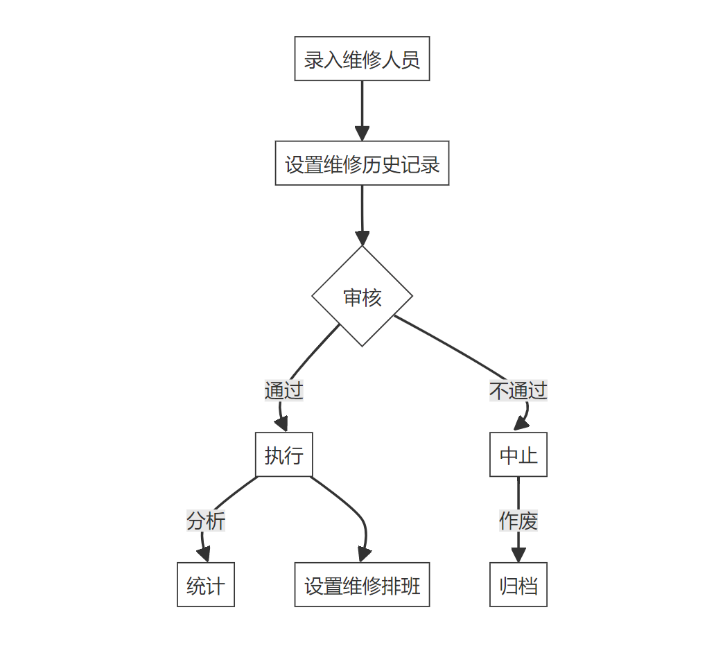 维修人员管理功能主要字段属性包括:维修人员编码、员工编码、姓名、性别、联系电话、身份证号、职位、技术职称、部门和状态。数据录入时,系统提供标准模板导入与手动输入两种方式;查询时支持按条件筛选如姓名或所属部门等信息,并能导出结果方便查看;变更信息需经审批流程确认后再更新数据库;审核功能允许管理人员检查记录的真实性及准确性;统计分析则能够生成各类报表如人员分布、技术职称占比等,辅助决策。