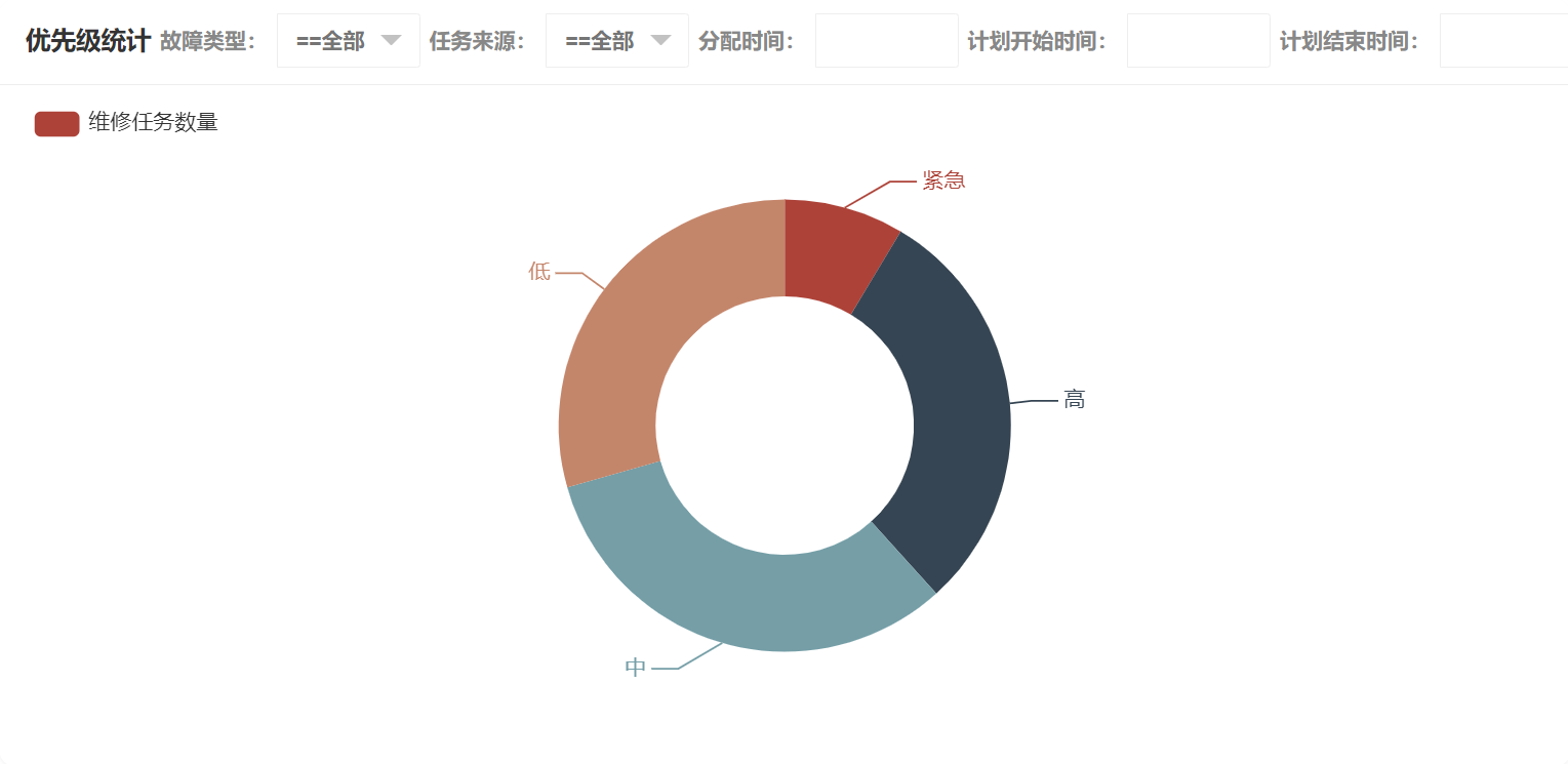 在维修任务统计中可以看到故障类型统计、优先级统计、任务来源统计、分配时间年统计、分配时间月统计、分配时间日统计、计划开始时间年统计、计划开始时间月统计、计划开始时间日统计、计划结束时间年统计、计划结束时间月统计、计划结束时间日统计、实际开始时间年统计、实际开始时间月统计、实际开始时间日统计、实际结束时间年统计、实际结束时间月统计、实际结束时间日统计、任务状态统计,优先级统计如图所示: