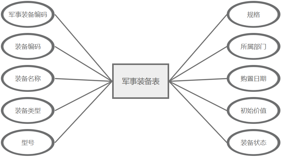 军事装备管理主要属性包括:军事装备编码、装备编码、装备名称、装备类型、型号、规格、所属部门、购置日期、初始价值、装备状态。