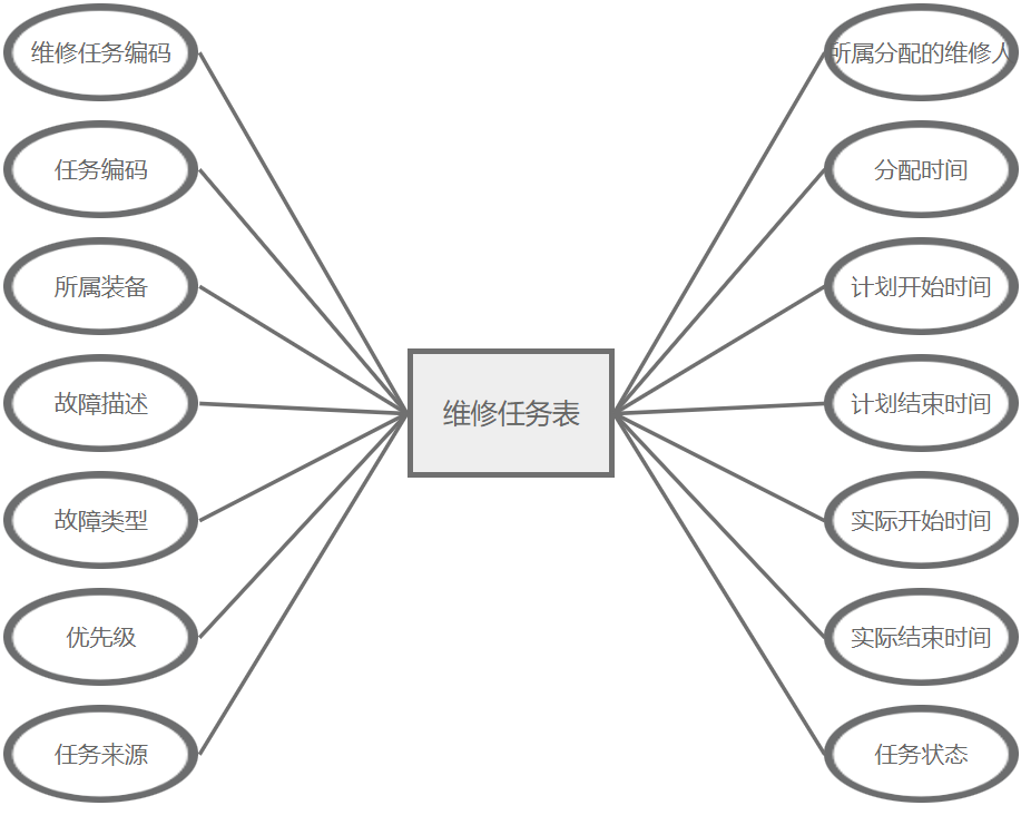 维修任务管理主要属性包括:维修任务编码、任务编码、所属装备、故障描述、故障类型、优先级、任务来源、所属分配的维修人员、分配时间、计划开始时间、计划结束时间、实际开始时间、实际结束时间、任务状态。