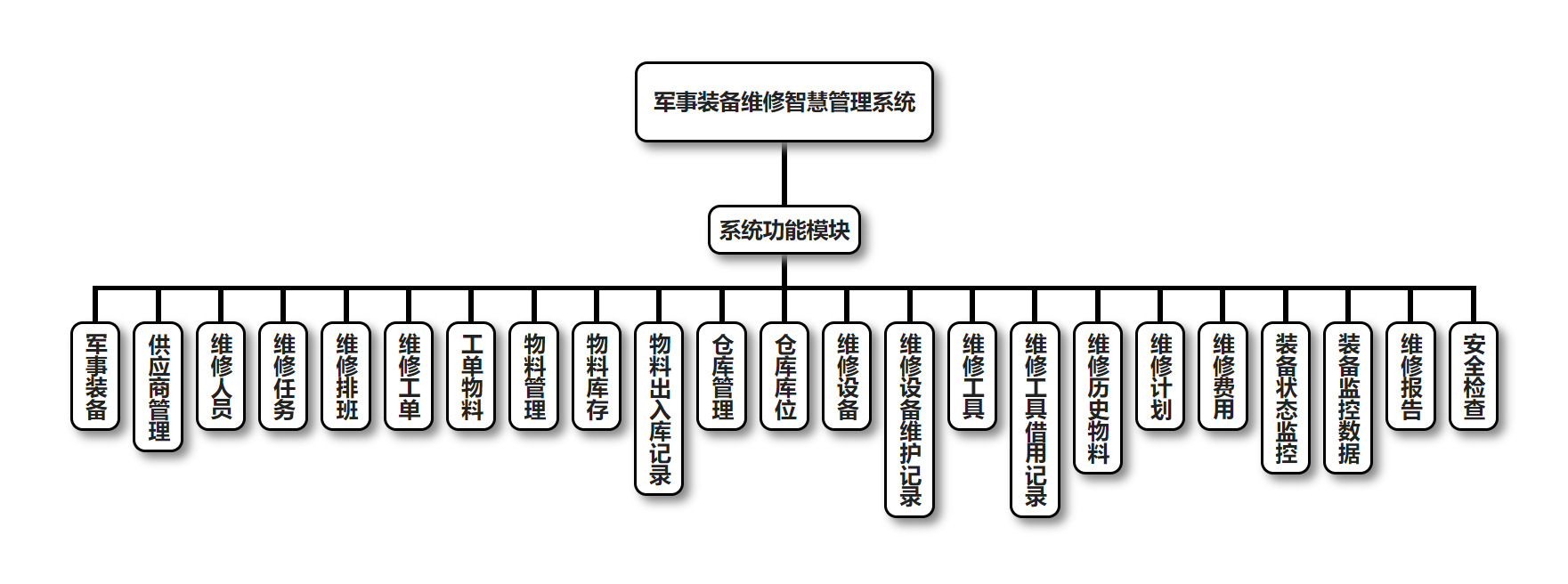 军事装备维修智慧管理系统的主要功能包括:军事装备管理、供应商管理、维修人员管理、维修任务管理、维修排班管理、维修工单管理、工单物料管理、物料管理、物料库存管理、物料出入库记录管理、仓库管理、仓库库位管理、维修设备管理、维修设备维护记录管理、维修工具管理、维修工具借用记录管理、维修历史物料管理、维修计划管理、维修费用管理、装备状态监控管理、装备监控数据管理、维修报告管理、安全检查管理。