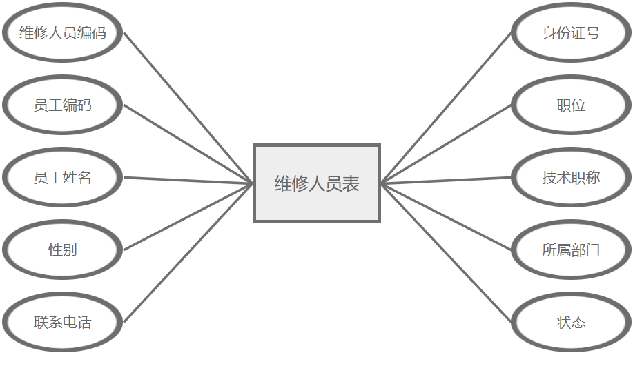 维修人员管理主要属性包括:维修人员编码、员工编码、员工姓名、性别、联系电话、身份证号、职位、技术职称、所属部门、状态。