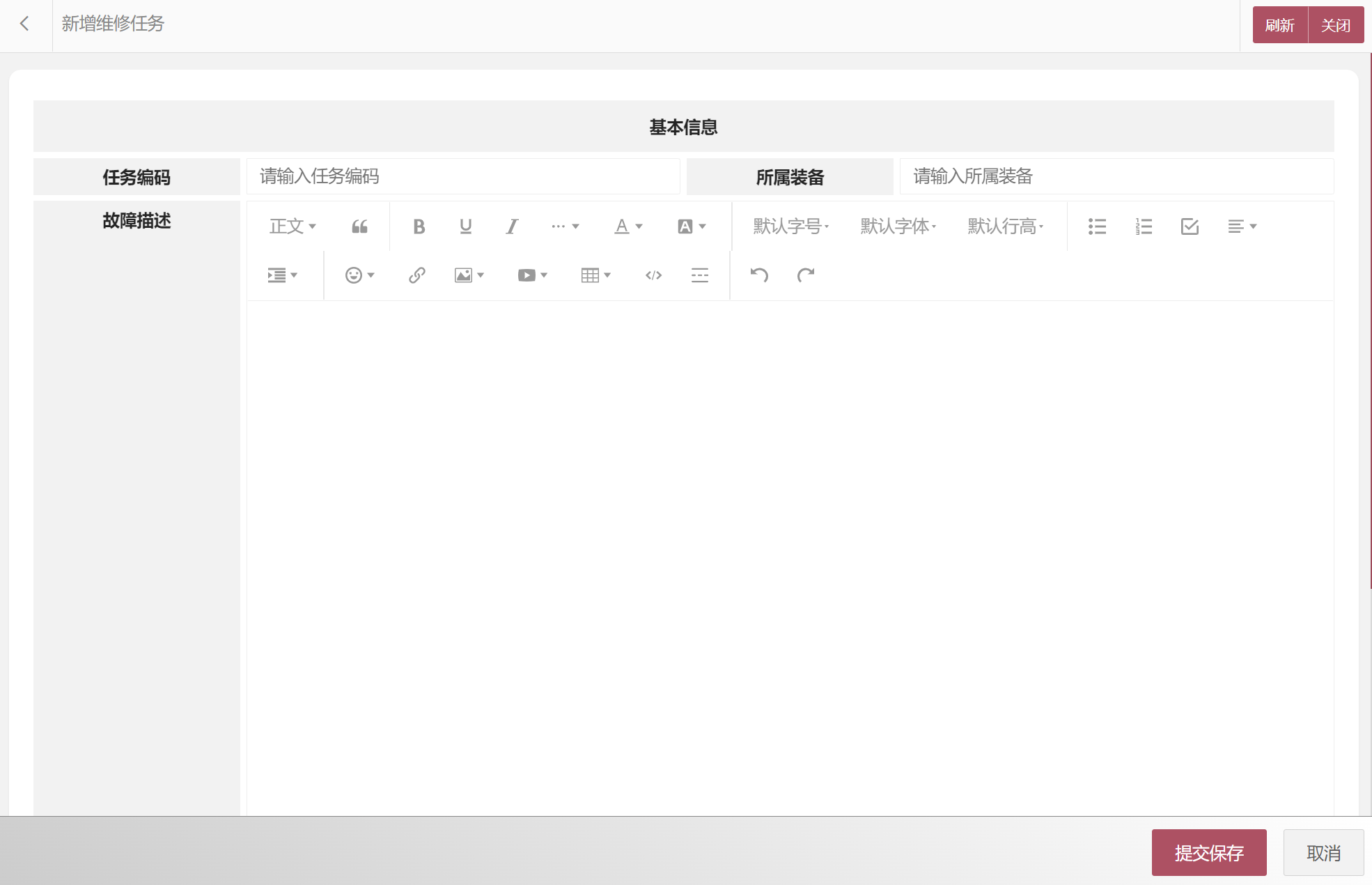 在维修任务列表中可以选择新增维修任务、编辑维修任务、删除维修任务、搜索维修任务等。维修任务属性包括:维修任务编码、任务编码、所属装备、故障描述、故障类型、优先级、任务来源、所属分配的维修人员、分配时间、计划开始时间、计划结束时间、实际开始时间、实际结束时间、任务状态等。新增维修任务界面如图所示: