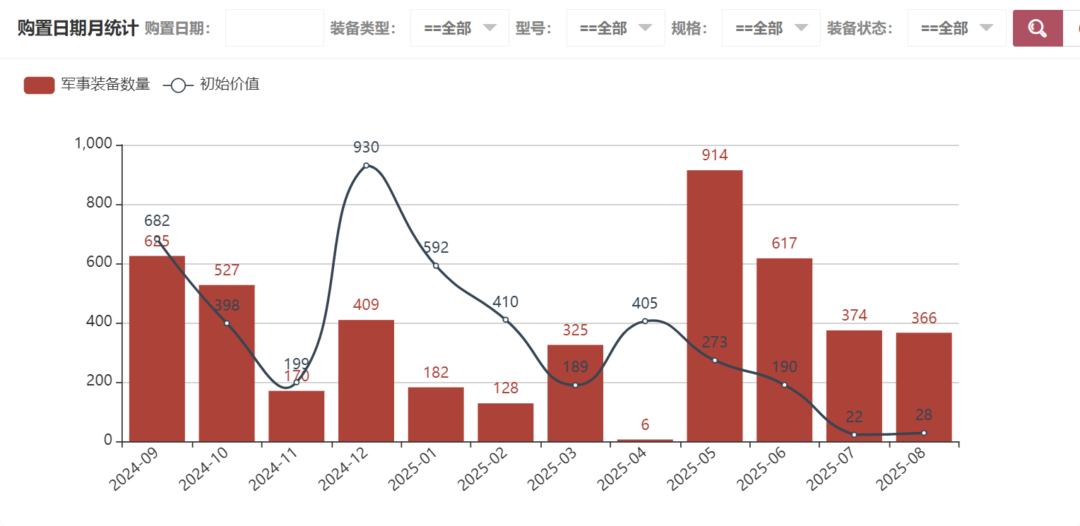 在军事装备统计中可以看到装备类型统计、型号统计、规格统计、购置日期年统计、购置日期月统计、购置日期日统计、装备状态统计,购置日期月统计如图所示: