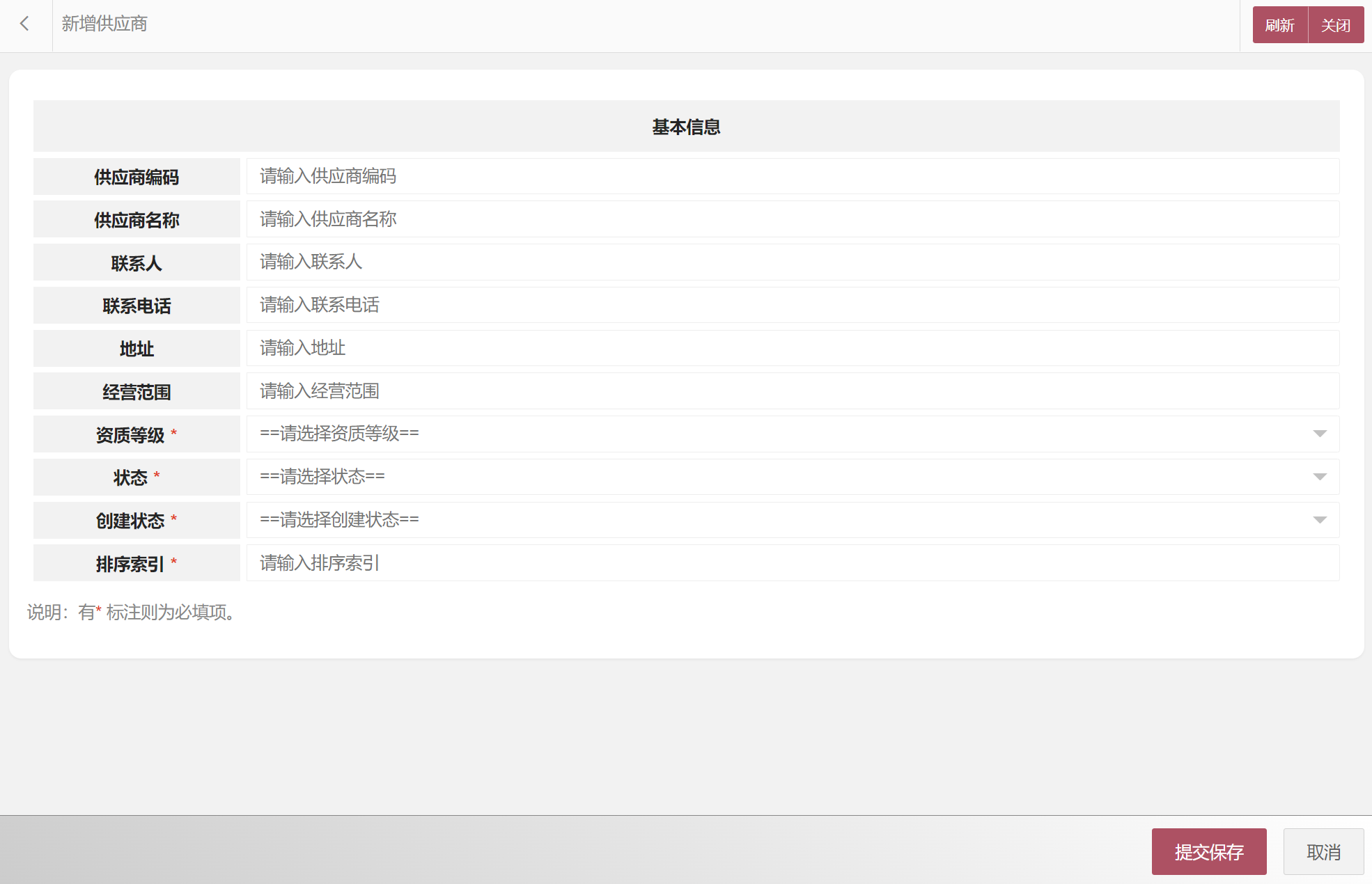 在供应商列表中可以选择新增供应商、编辑供应商、删除供应商、搜索供应商等。供应商属性包括:供应商编码、供应商编码、供应商名称、联系人、联系电话、地址、经营范围、资质等级、状态等。新增供应商界面如图所示: