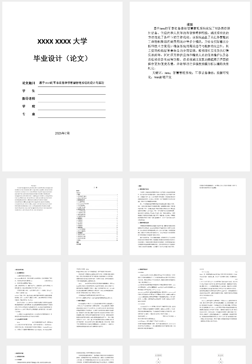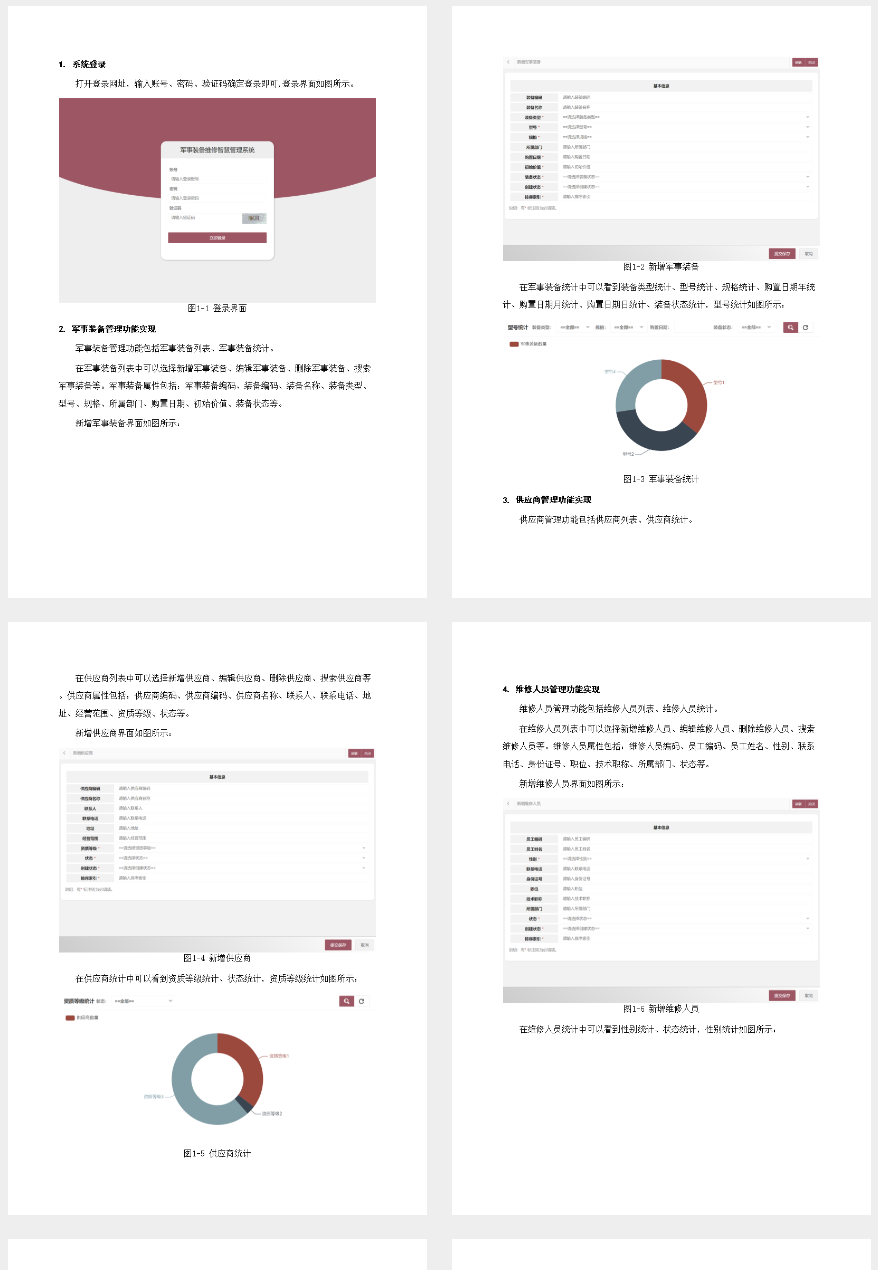 军事装备维修智慧管理系统通过引入先进的信息化管理手段,提升军队后勤保障效率和管理水平。该系统相较于传统管理模式具有显著优势:首先,它实现了从设备采购到维护的全生命周期跟踪;其次,智能化决策支持模块能够有效降低运营成本并提高响应速度;再者,数据可视化功能使得管理层可以直观了解装备状态及维修进度。 系统设计与实现采用SpringMVC框架构建前端和后端交互,并使用MySQL数据库存储各类信息。通过细致的需求分析,该系统分为军事装备管理、供应商管理等多个模块,每个模块均涵盖了必要的字段属性以确保全面性;同时提供了从普通员工到部门领导的角色权限控制机制。 本项目特别关注用户体验与操作便捷性,在满足专业需求的同时保证了零基础开发者能够快速上手。相比其他复杂的管理系统,该系统功能划分清晰、开发难度适中,不仅适用于军事装备维修领域还具备广泛的应用前景;通过集成最新技术手段和设计理念,确保其在实际应用中的高效性和稳定性。