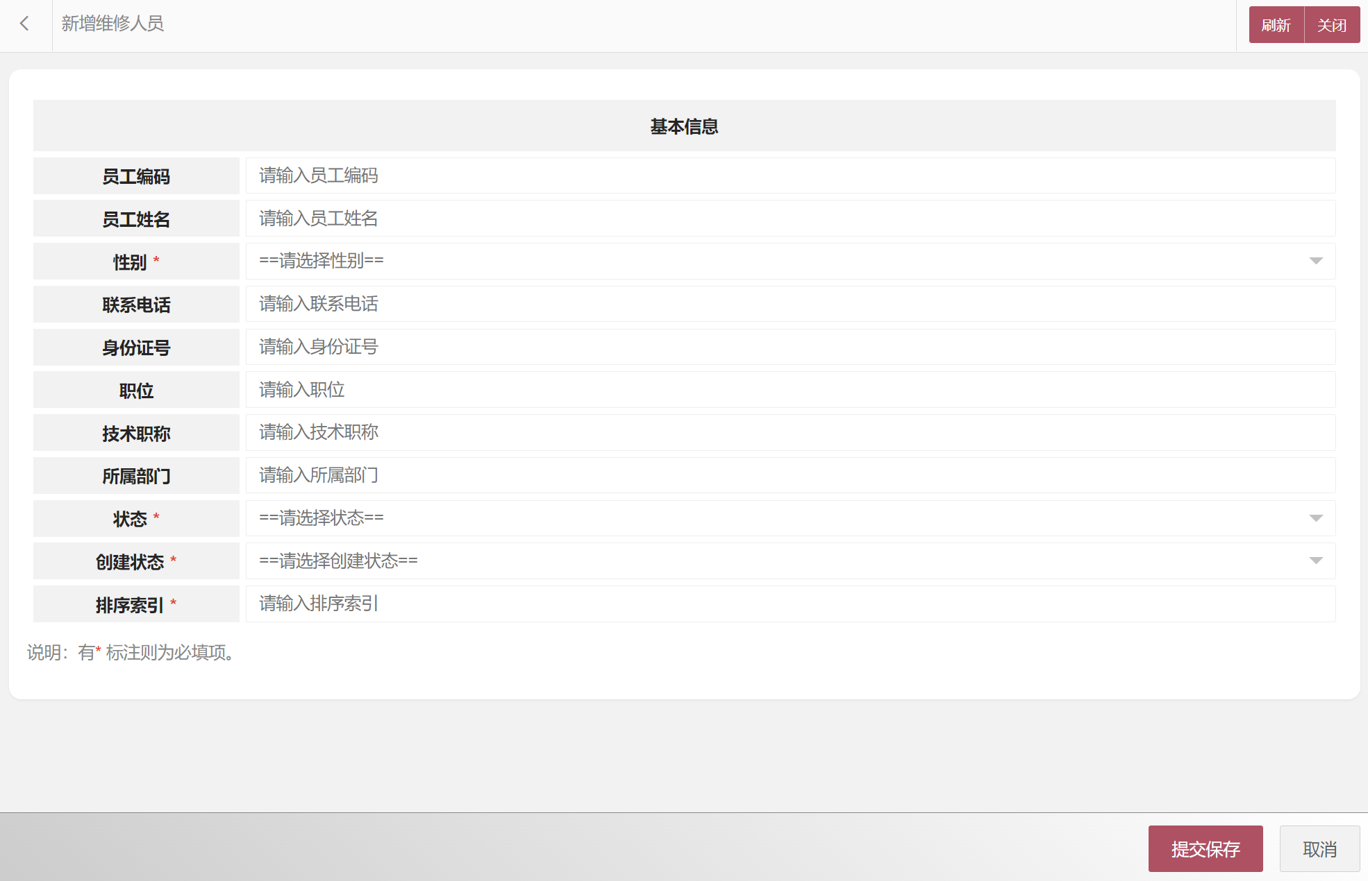 在维修人员列表中可以选择新增维修人员、编辑维修人员、删除维修人员、搜索维修人员等。维修人员属性包括:维修人员编码、员工编码、员工姓名、性别、联系电话、身份证号、职位、技术职称、所属部门、状态等。新增维修人员界面如图所示: