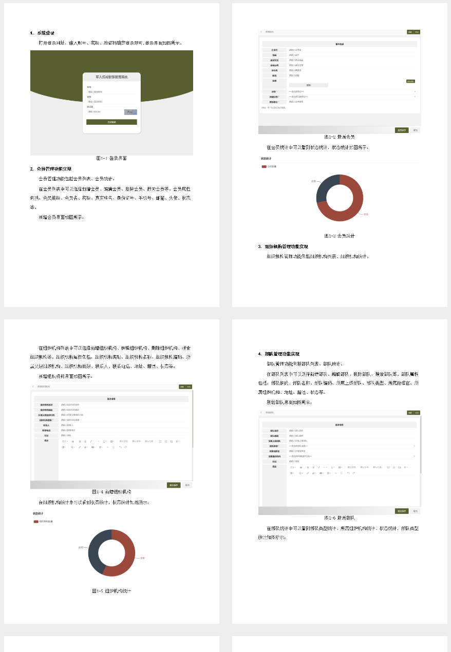 组织机构管理中参与的角色用例包括普通员工和部门领导。普通员工角色负责录入、查阅及信息变更,具体操作如添加新机构、修改现有机构信息或删除旧记录;部门领导则进行数据审核与统计分析,确保系统内所有机构的信息准确无误并保持一致状态。此模块详细描述涵盖:1.组织架构配置-创建和编辑各级别组织结构详情2.权限分配-设立不同用户对各类操作的访问级别3.数据校验规则设定-保证输入信息符合预设规范4.历史记录跟踪与版本管理-保存修改痕迹便于追溯5.状态监控及报警机制设置-实时反馈机构变动或异常情况6.报表生成功能-自动生成组织结构图或其他形式的数据报告7.接口对接与其他系统集成确保数据一致性。