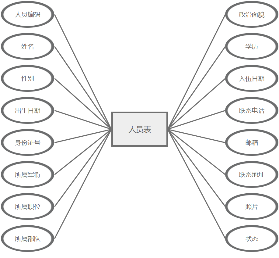 人员管理主要属性包括:人员编码、姓名、性别、出生日期、身份证号、所属军衔、所属职位、所属部队、政治面貌、学历、入伍日期、联系电话、邮箱、联系地址、照片、状态。