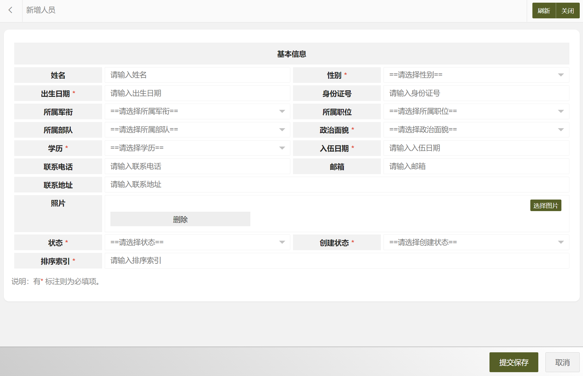 在人员列表中可以选择新增人员、编辑人员、删除人员、搜索人员等。人员属性包括:人员编码、姓名、性别、出生日期、身份证号、所属军衔、所属职位、所属部队、政治面貌、学历、入伍日期、联系电话、邮箱、联系地址、照片、状态等。新增人员界面如图所示: