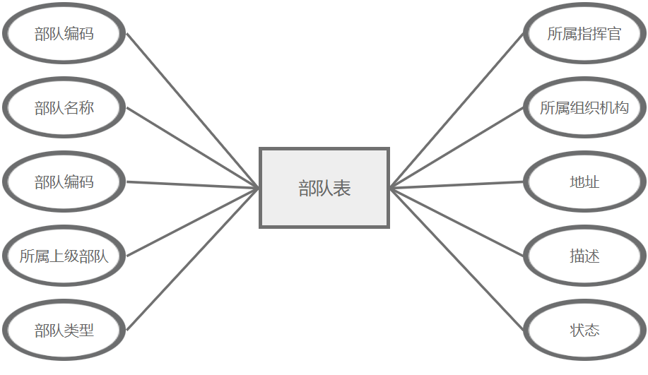 部队管理主要属性包括:部队编码、部队名称、部队编码、所属上级部队、部队类型、所属指挥官、所属组织机构、地址、描述、状态。