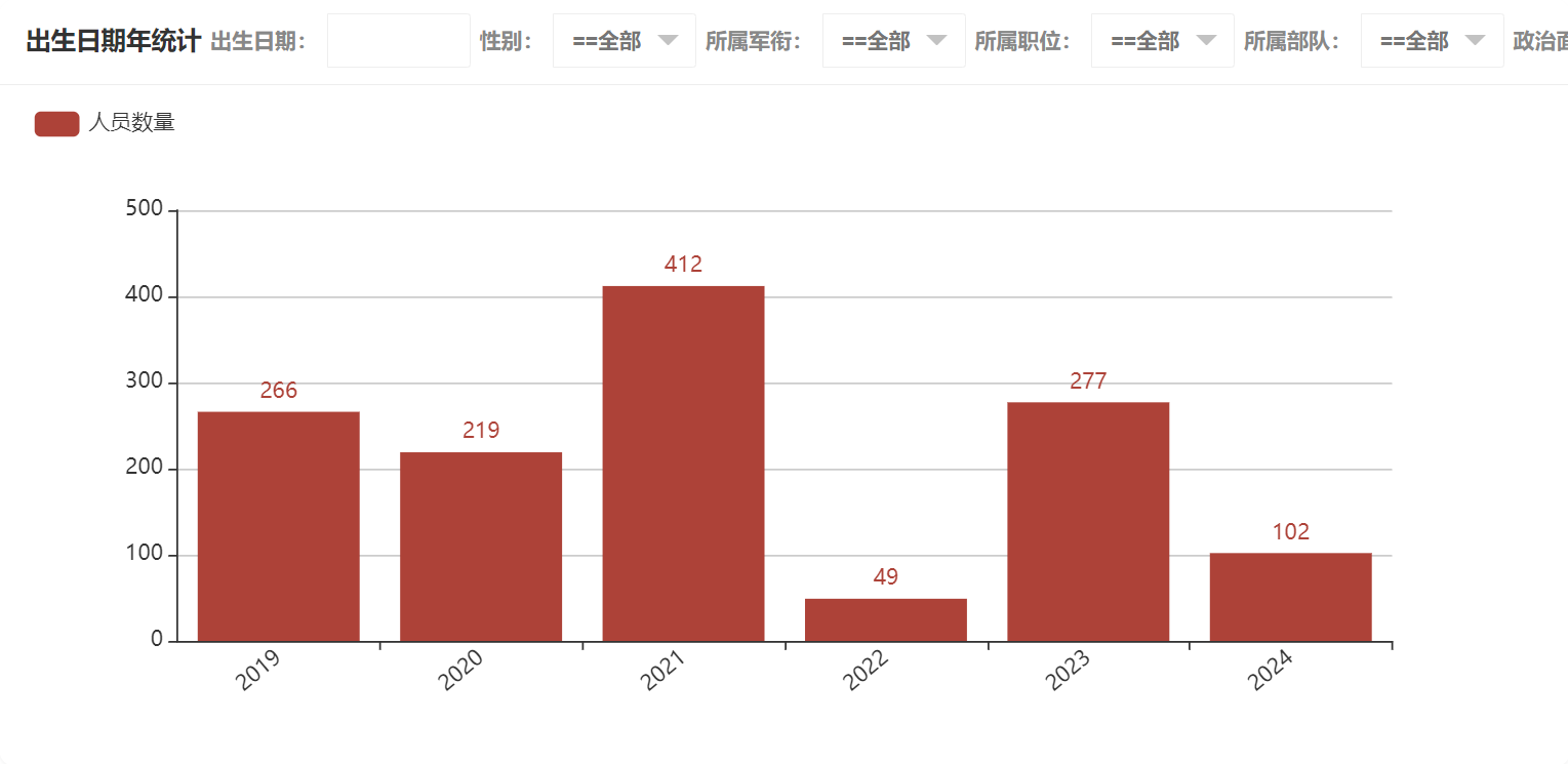 在人员统计中可以看到性别统计、出生日期年统计、出生日期月统计、出生日期日统计、所属军衔统计、所属职位统计、所属部队统计、政治面貌统计、学历统计、入伍日期年统计、入伍日期月统计、入伍日期日统计、状态统计,出生日期年统计如图所示: