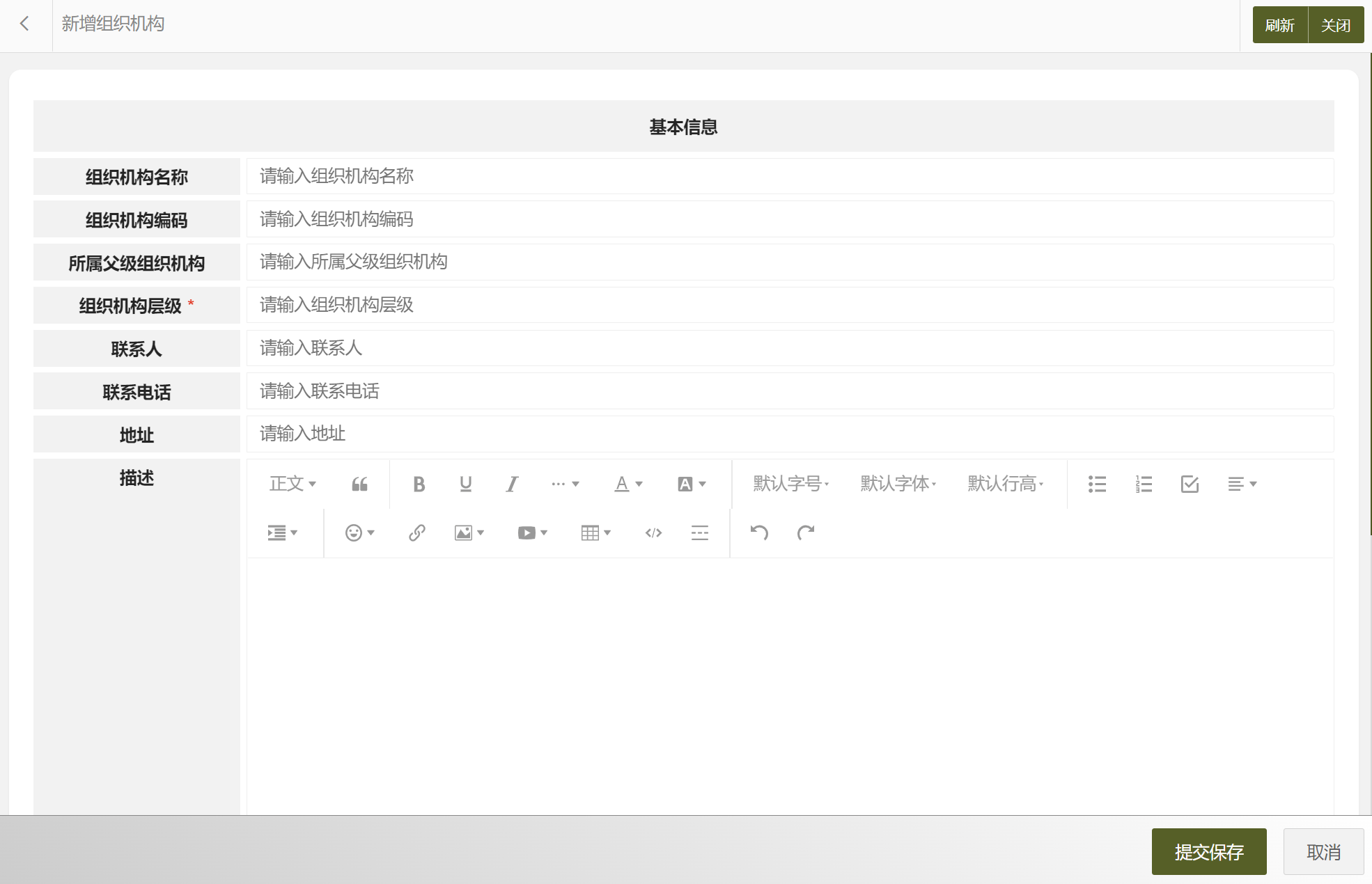在组织机构列表中可以选择新增组织机构、编辑组织机构、删除组织机构、搜索组织机构等。组织机构属性包括:组织机构编码、组织机构名称、组织机构编码、所属父级组织机构、组织机构层级、联系人、联系电话、地址、描述、状态等。新增组织机构界面如图所示: