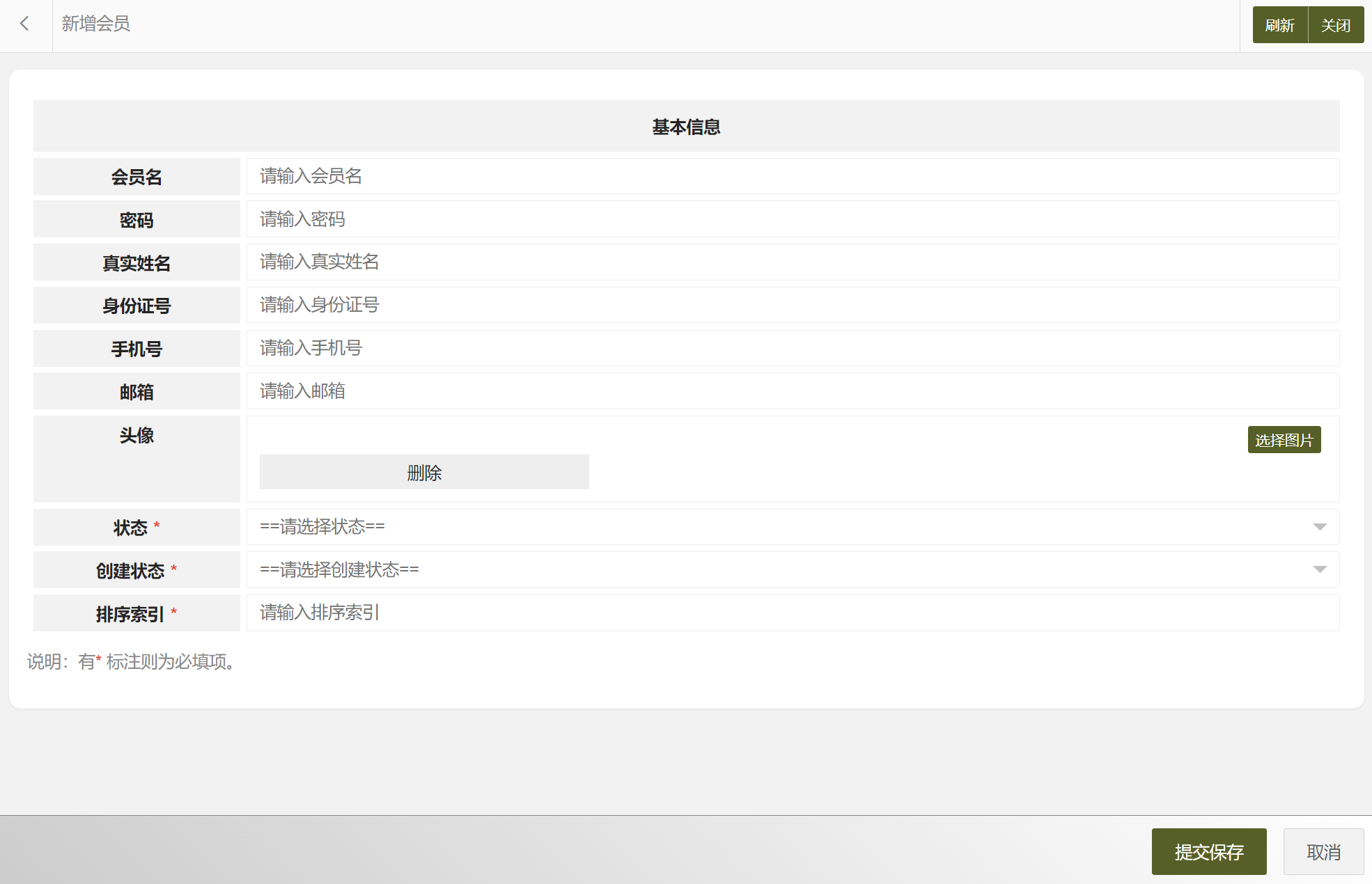 在会员列表中可以选择新增会员、编辑会员、删除会员、搜索会员等。会员属性包括:会员编码、会员名、密码、真实姓名、身份证号、手机号、邮箱、头像、状态等。新增会员界面如图所示: