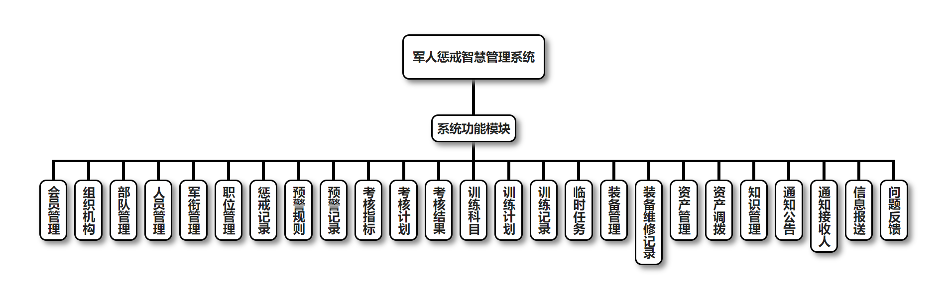 军人惩戒智慧管理系统的主要功能包括:会员管理、组织机构管理、部队管理、人员管理、军衔管理、职位管理、惩戒记录管理、预警规则管理、预警记录管理、考核指标管理、考核计划管理、考核结果管理、训练科目管理、训练计划管理、训练记录管理、临时任务管理、装备管理、装备维修记录管理、资产管理、资产调拨管理、知识管理、通知公告管理、通知接收人管理、报送管理、问题反馈管理。