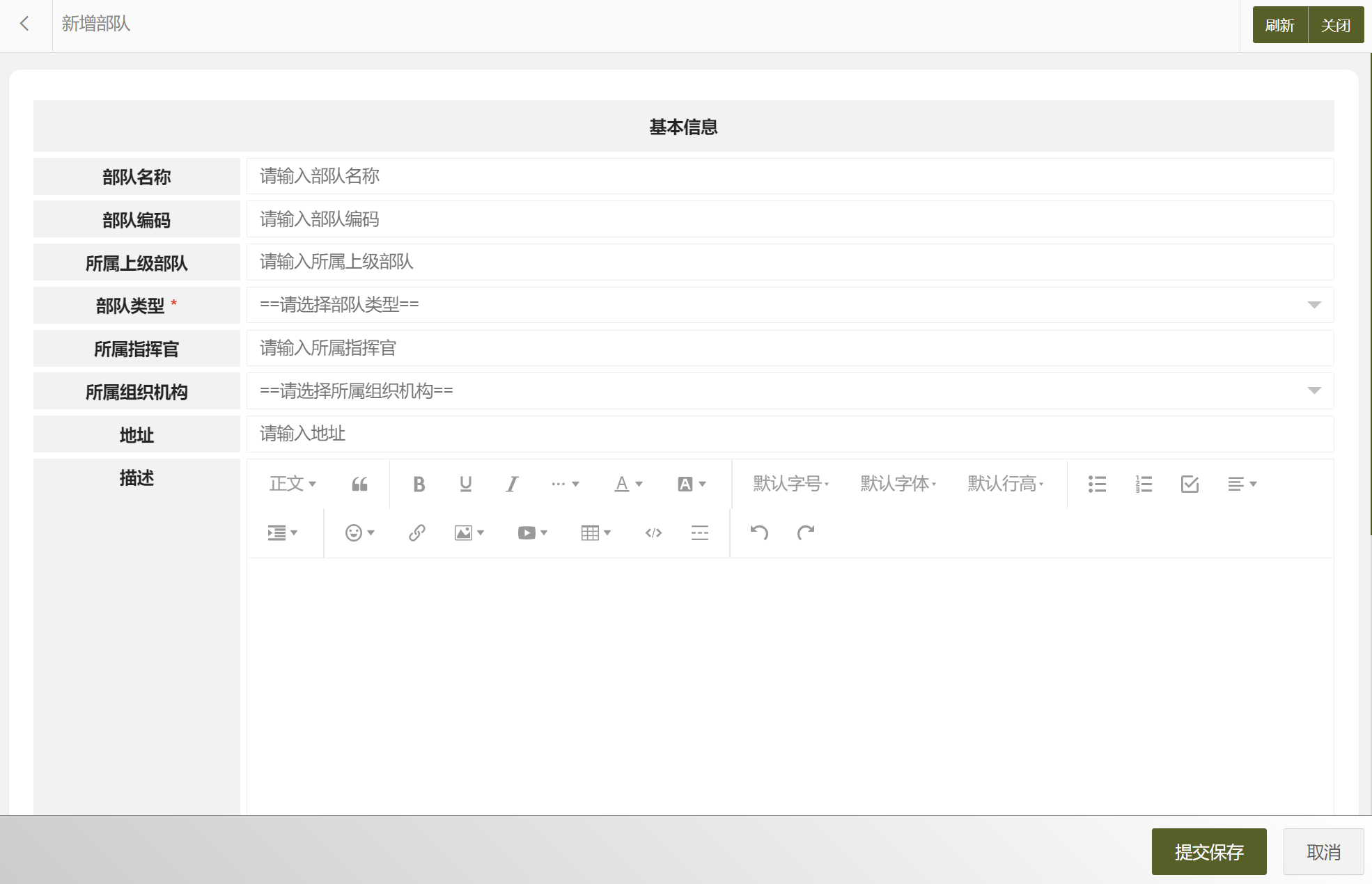 在部队列表中可以选择新增部队、编辑部队、删除部队、搜索部队等。部队属性包括:部队编码、部队名称、部队编码、所属上级部队、部队类型、所属指挥官、所属组织机构、地址、描述、状态等。新增部队界面如图所示: