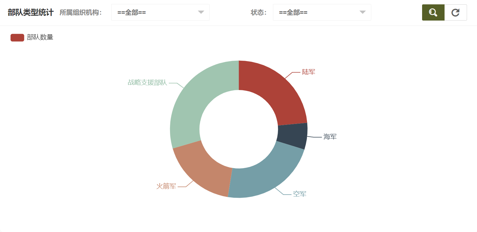 在部队统计中可以看到部队类型统计、所属组织机构统计、状态统计,部队类型统计如图所示:
