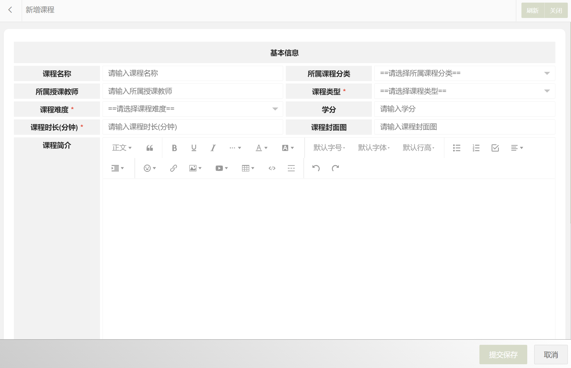 在课程列表中可以选择新增课程、编辑课程、删除课程、搜索课程等。课程属性包括:课程编码、课程名称、所属课程分类、所属授课教师、课程类型、课程难度、学分、课程时长(分钟)、课程封面图、课程简介、课程目标、课程大纲、先修要求、课程状态、发布时间、报名开始时间、报名结束时间、选课人数、浏览次数、课程评分等。新增课程界面如图所示: