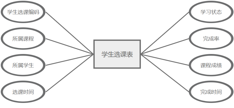 学生选课管理主要属性包括:学生选课编码、所属课程、所属学生、选课时间、学习状态、完成率、课程成绩、完成时间。