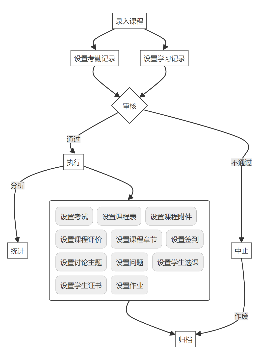 课程章节管理字段属性涵盖编码、所属课程、父章节等。数据录入时需确保信息准确,查询功能支持按编码或名称检索;变更操作包括修改内容和状态;审核由部门领导完成以保障数据质量;统计分析则提供如浏览次数、选课人数的报表帮助决策。