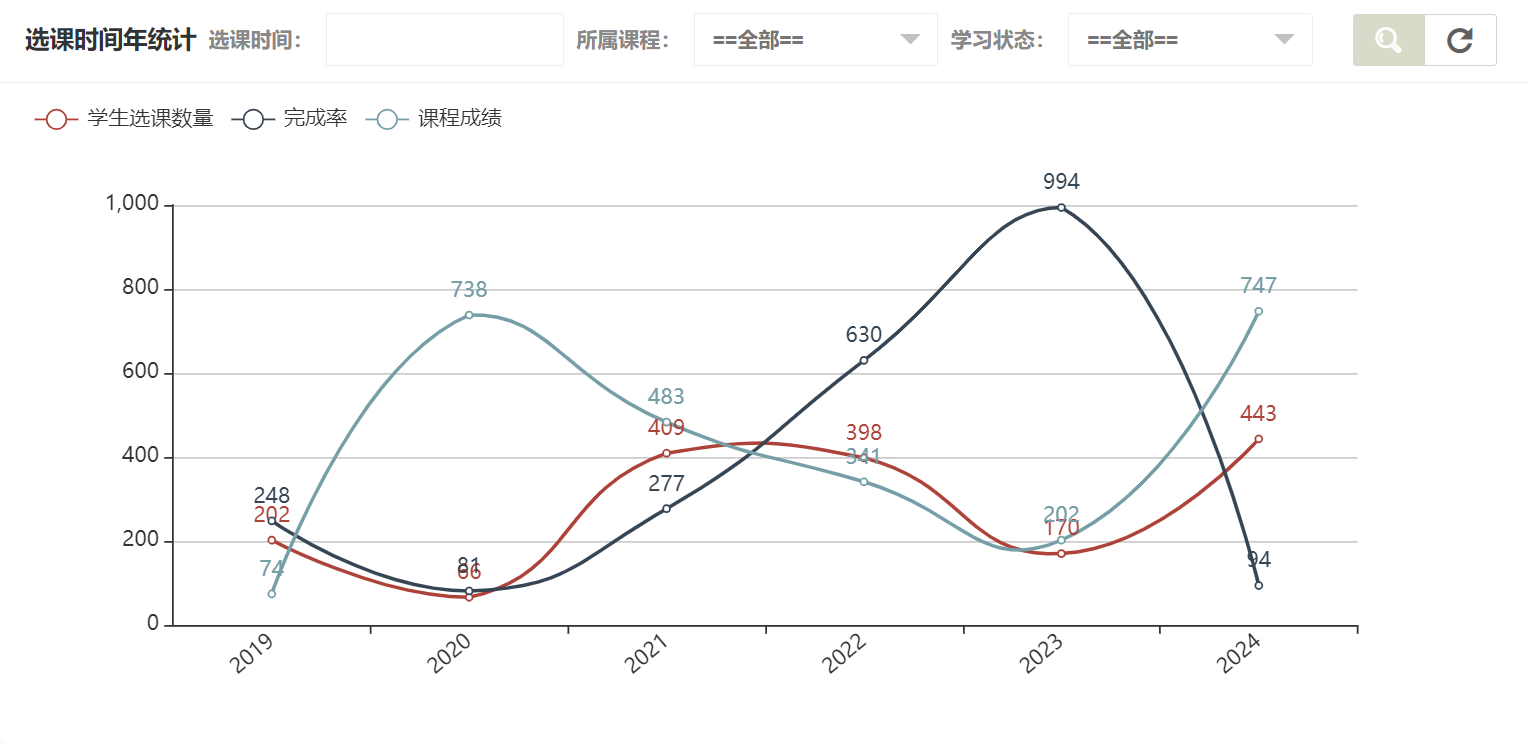 在学生选课统计中可以看到所属课程统计、选课时间年统计、选课时间月统计、选课时间日统计、学习状态统计、完成时间年统计、完成时间月统计、完成时间日统计,选课时间年统计如图所示: