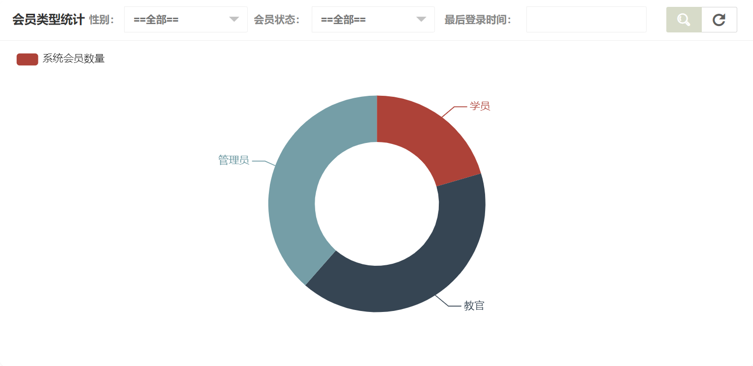 在系统会员统计中可以看到性别统计、会员类型统计、会员状态统计、最后登录时间年统计、最后登录时间月统计、最后登录时间日统计,会员类型统计如图所示: