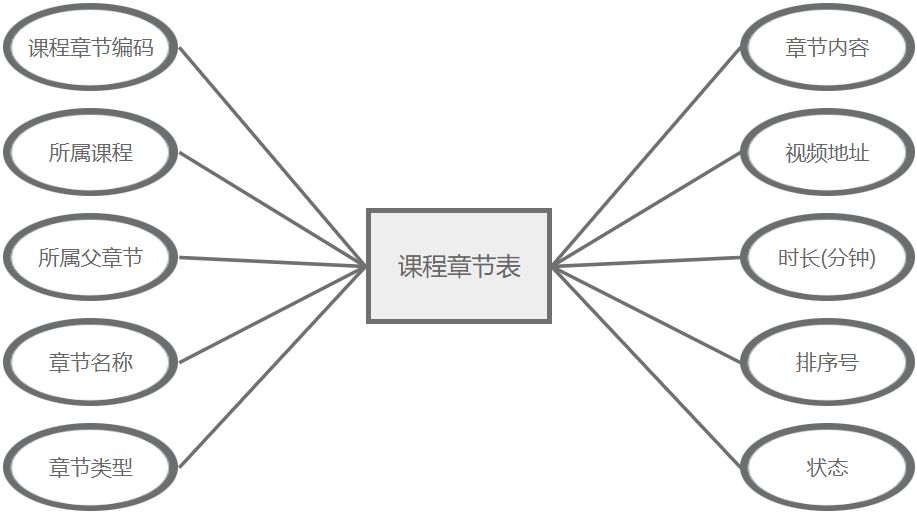 课程章节管理主要属性包括:课程章节编码、所属课程、所属父章节、章节名称、章节类型、章节内容、视频地址、时长(分钟)、排序号、状态。