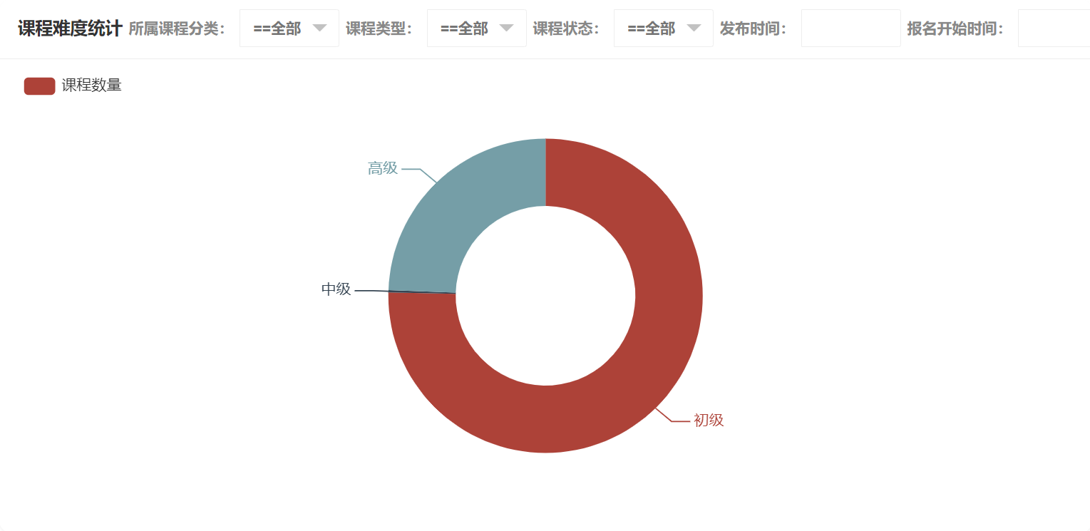 在课程统计中可以看到所属课程分类统计、课程类型统计、课程难度统计、课程状态统计、发布时间年统计、发布时间月统计、发布时间日统计、报名开始时间年统计、报名开始时间月统计、报名开始时间日统计、报名结束时间年统计、报名结束时间月统计、报名结束时间日统计,课程难度统计如图所示: