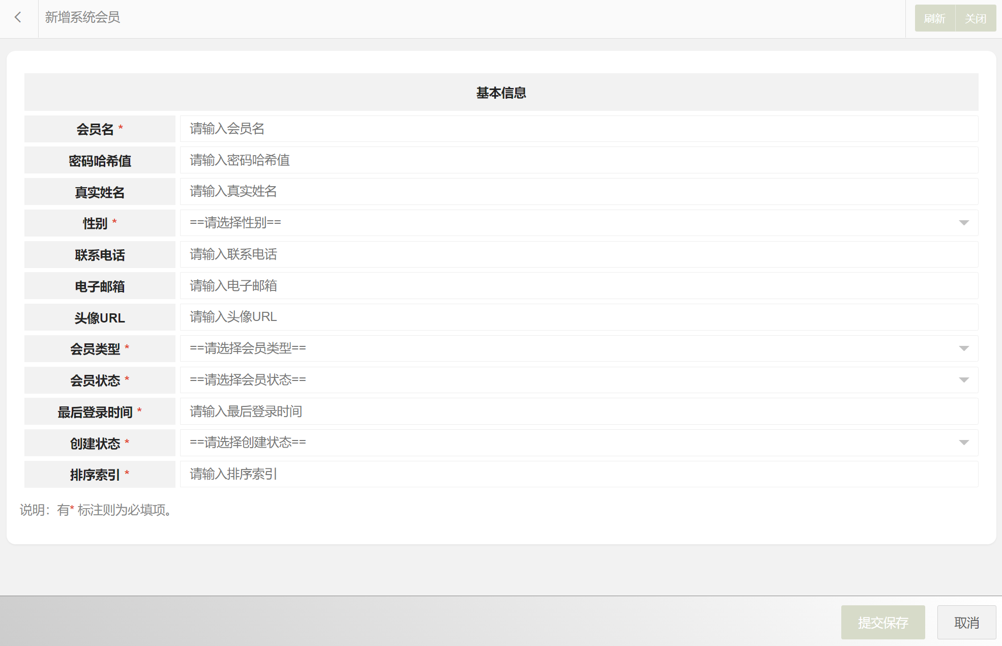 在系统会员列表中可以选择新增系统会员、编辑系统会员、删除系统会员、搜索系统会员等。系统会员属性包括:系统会员编码、会员名、密码哈希值、真实姓名、性别、联系电话、电子邮箱、头像URL、会员类型、会员状态、最后登录时间等。新增系统会员界面如图所示: