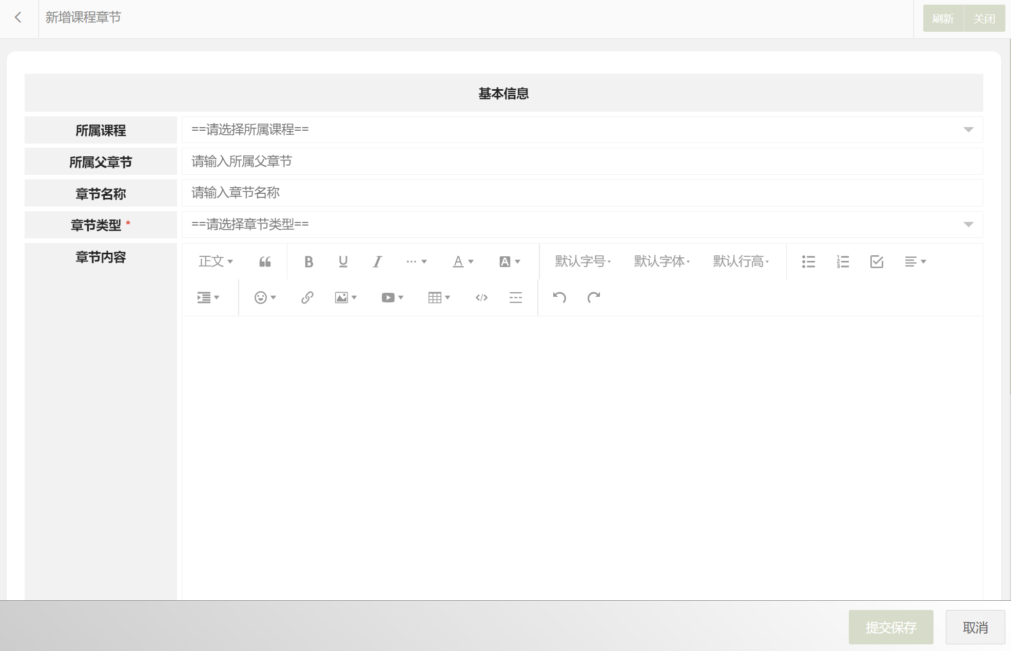 在课程章节列表中可以选择新增课程章节、编辑课程章节、删除课程章节、搜索课程章节等。课程章节属性包括:课程章节编码、所属课程、所属父章节、章节名称、章节类型、章节内容、视频地址、时长(分钟)、排序号、状态等。新增课程章节界面如图所示: