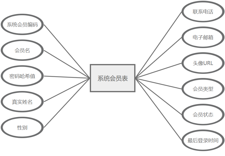 系统会员管理主要属性包括:系统会员编码、会员名、密码哈希值、真实姓名、性别、联系电话、电子邮箱、头像URL、会员类型、会员状态、最后登录时间。