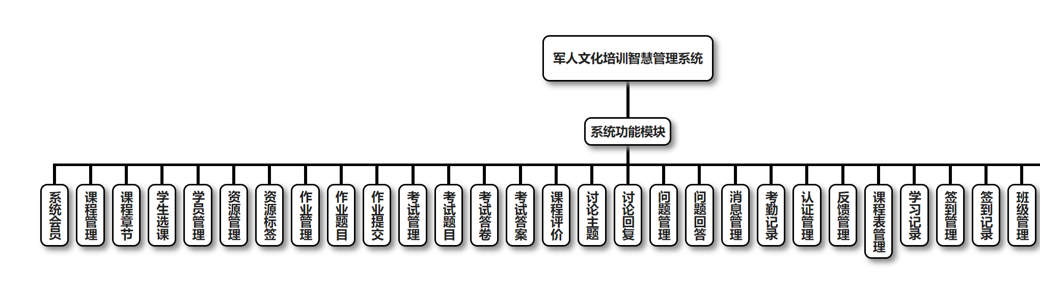 军人文化培训智慧管理系统的主要功能包括:系统会员管理、课程管理、课程章节管理、学生选课管理、学员管理、资源管理、资源标签管理、作业管理、作业题目管理、作业提交管理、考试管理、考试题目管理、考试答卷管理、考试答案管理、课程评价管理、讨论主题管理、讨论回复管理、问题管理、问题回答管理、消息管理、考勤记录管理、认证管理、反馈管理、课程表管理、学习记录管理、签到管理、签到记录管理、班级管理、证书模板管理、学生证书管理、问卷管理、问卷题目管理、问卷回答管理。