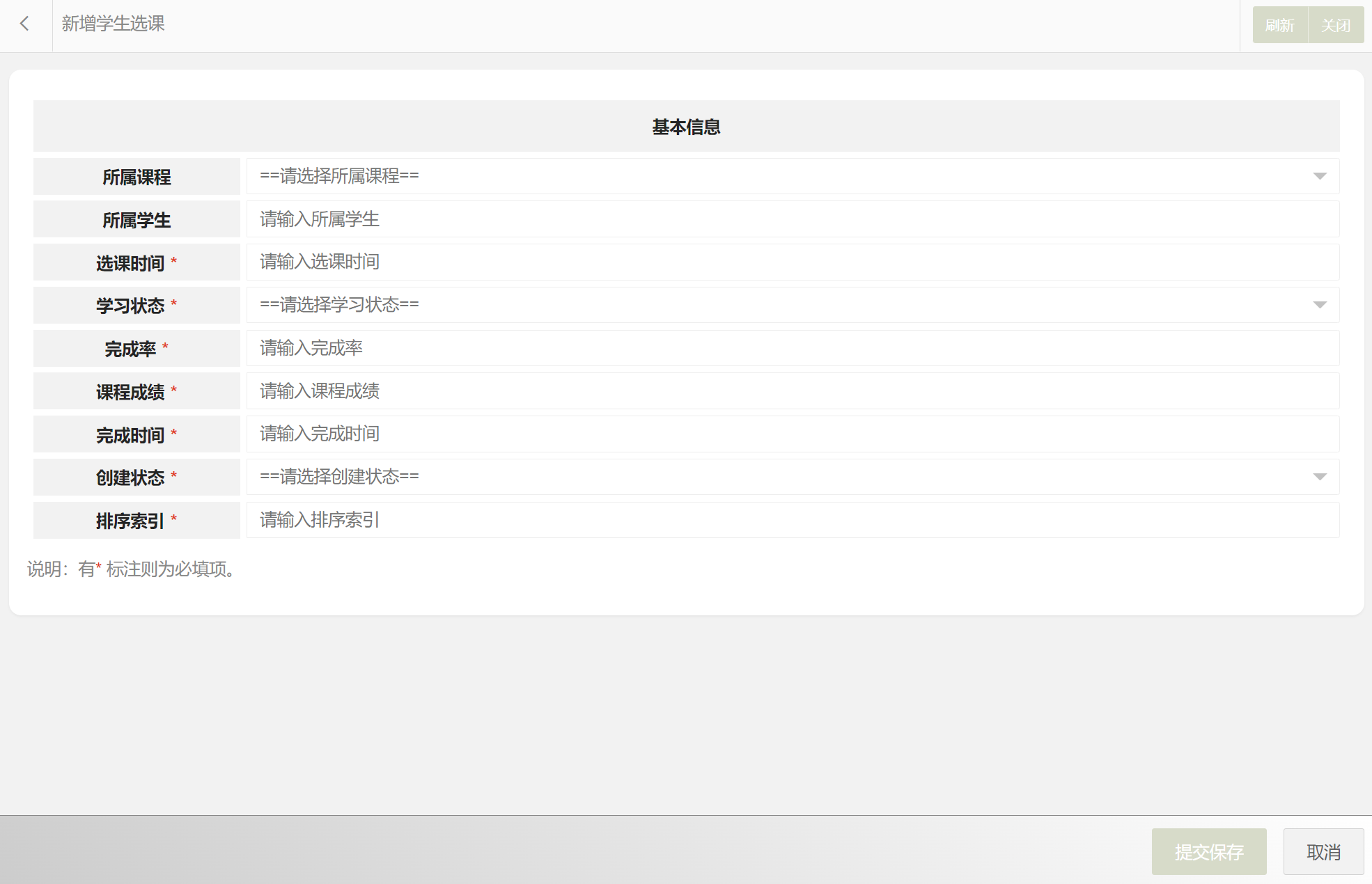 在学生选课列表中可以选择新增学生选课、编辑学生选课、删除学生选课、搜索学生选课等。学生选课属性包括:学生选课编码、所属课程、所属学生、选课时间、学习状态、完成率、课程成绩、完成时间等。新增学生选课界面如图所示: