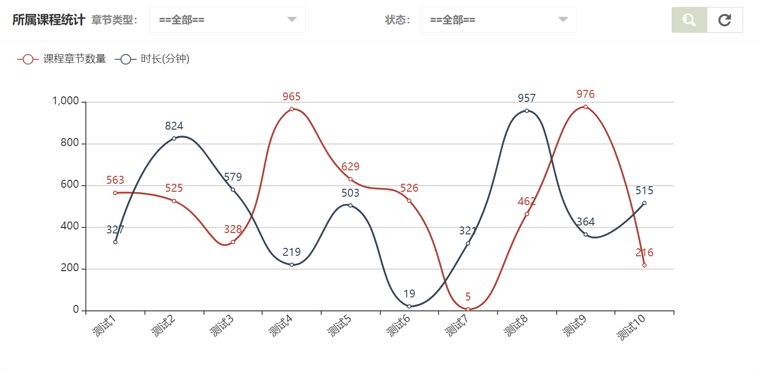 在课程章节统计中可以看到所属课程统计、章节类型统计、状态统计,所属课程统计如图所示: