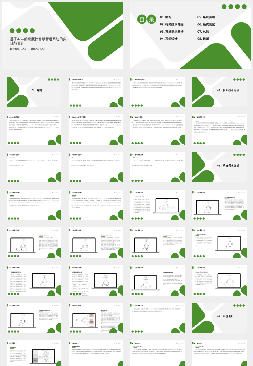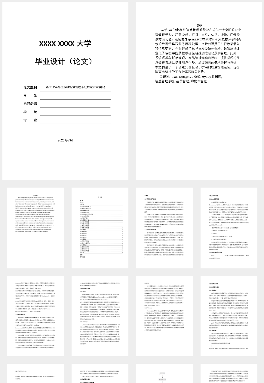 出版社智慧管理系统旨在提升编辑、出版及运营效率,主要功能模块包括:会员管理(包含基本信息录入与维护)、栏目管理(分类组织内容资源);文章管理(发布审核与更新信息);站点管理(网站相关信息设置),评论管理(用户反馈收集处理);广告管理(投放策略制定执行与效果监测)以及广告位管理(展示位置规划分配)。订单管理和商品管理则关注交易流程和商品详情,积分记录管理追踪会员活动激励机制。购物车管理方便顾客挑选并保存选购物品清单。人员管理和消息管理确保系统用户间沟通顺畅且权限分级合理。开发背景分析基于传统出版社运营痛点与现代科技整合需求;需求分析聚焦实际业务场景优化用户体验及提高工作效率;系统设计采用分层架构保证可扩展性,框架选择SpringMVC提升应用性能,数据库使用MySQL存储大量数据信息;系统实现过程中注重代码质量、文档编写和单元测试。