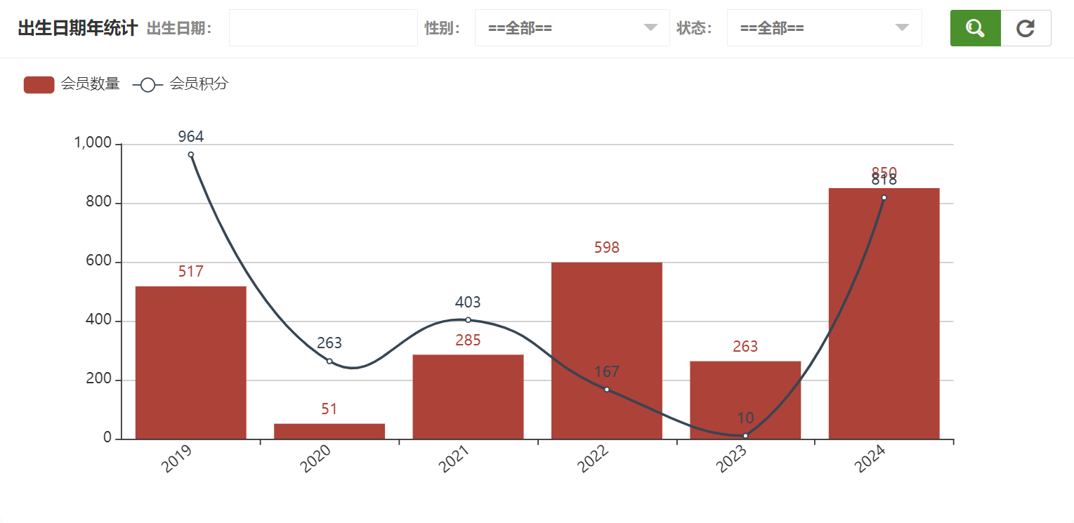 在会员统计中可以看到性别统计、出生日期年统计、出生日期月统计、出生日期日统计、注册时间年统计、注册时间月统计、注册时间日统计、最后登录时间年统计、最后登录时间月统计、最后登录时间日统计、状态统计,出生日期年统计如图所示: