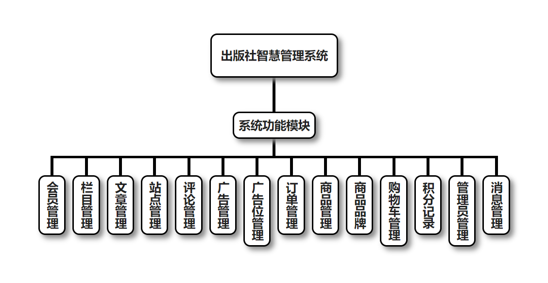 出版社智慧管理系统的主要功能包括:会员管理、栏目管理、文章管理、站点管理、评论管理、广告管理、广告位管理、订单管理、商品管理、商品品牌管理、购物车管理、积分记录管理、人员管理、消息管理。