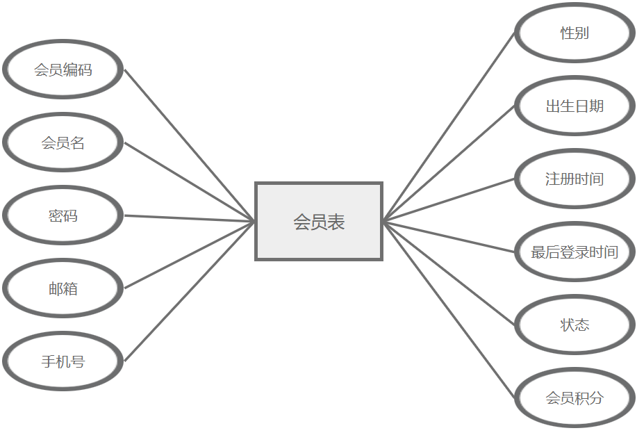 会员管理主要属性包括:会员编码、会员名、密码、邮箱、手机号、性别、出生日期、注册时间、最后登录时间、状态、会员积分。