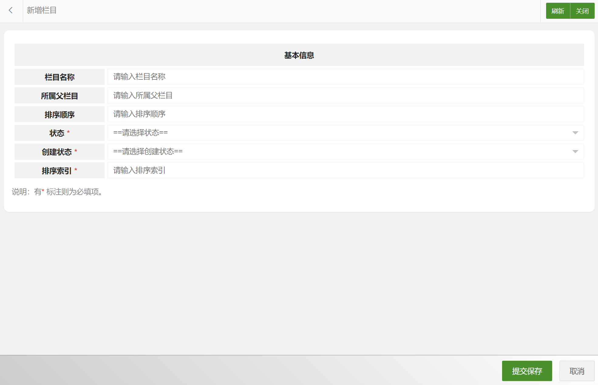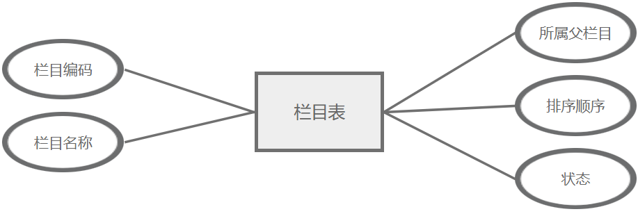 栏目管理主要属性包括:栏目编码、栏目名称、所属父栏目、排序顺序、状态。