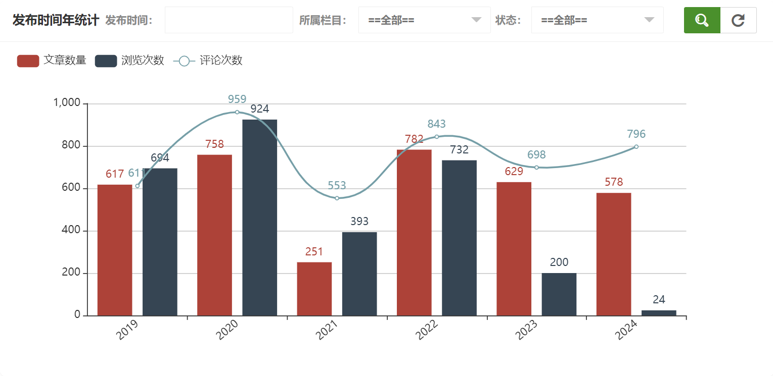 在文章统计中可以看到所属栏目统计、发布时间年统计、发布时间月统计、发布时间日统计、状态统计,发布时间年统计如图所示: