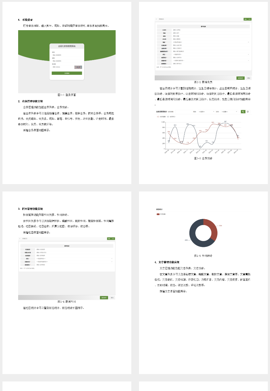 会员管理模块包括数据录入、查询执行、信息变更、审核以及统计分析。首先,普通员工可输入会员编码、名、密码、邮箱和手机号等基本信息完成数据录入;部门领导有权进行成员状态检查与更新操作,并根据需要修改性别及出生日期等内容。其次,在数据查询方面,系统提供多种筛选条件以供检索指定的会员信息。随后是信息变更功能,普通员工能够依据实际情况调整会员积分或角色属性。接着在审核阶段,部门领导需验证所有更改是否符合规定并批准相应的变动请求;最后,统计分析模块将汇总各类统计数据,如活跃用户数、新增注册量等,并生成相关图表通过ECharts.js进行展示,以便管理层做出更精准的决策。
