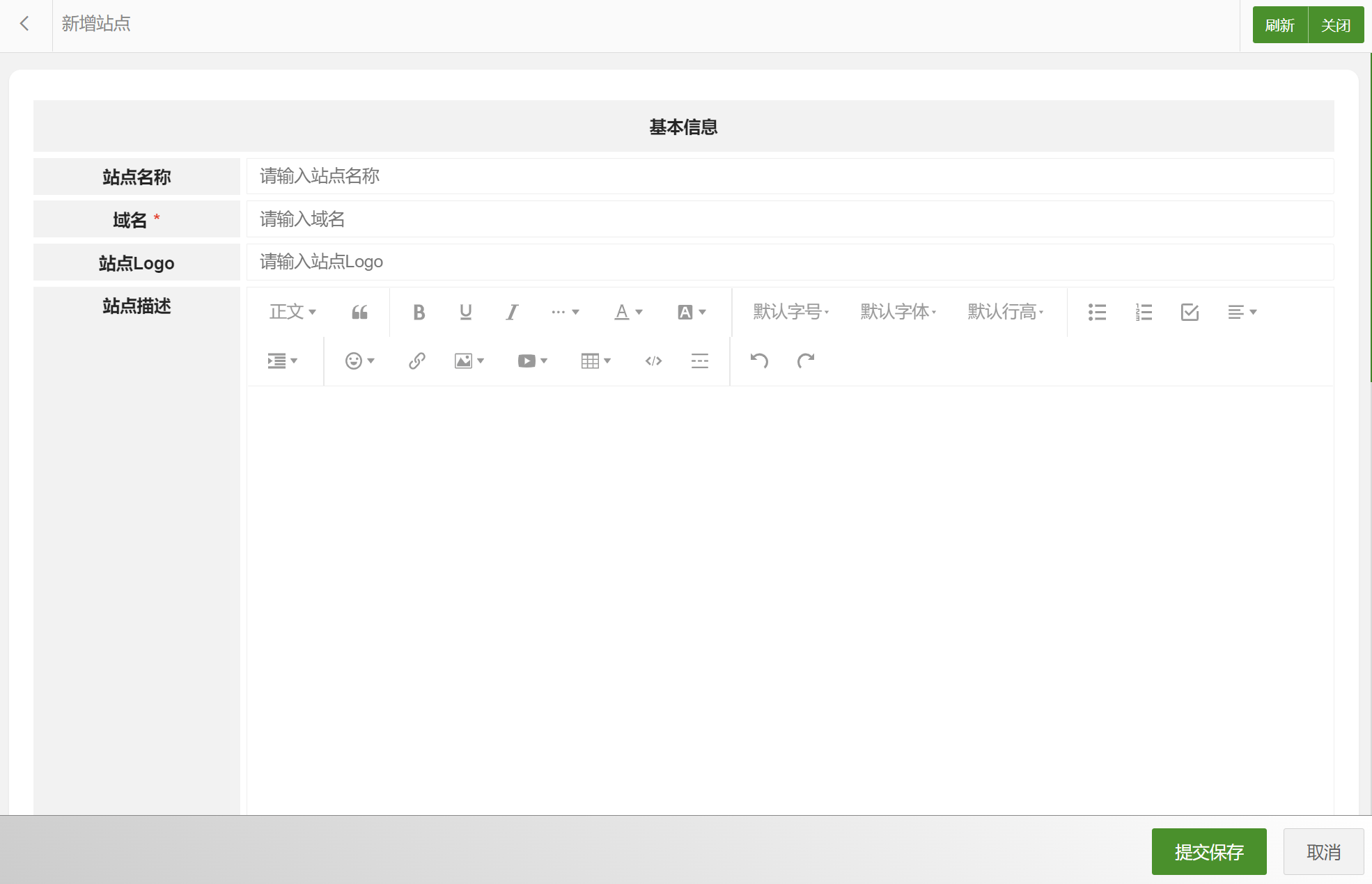 在站点列表中可以选择新增站点、编辑站点、删除站点、搜索站点等。站点属性包括:站点编码、站点名称、域名、站点Logo、站点描述、站点关键词、版权信息、状态等。新增站点界面如图所示: