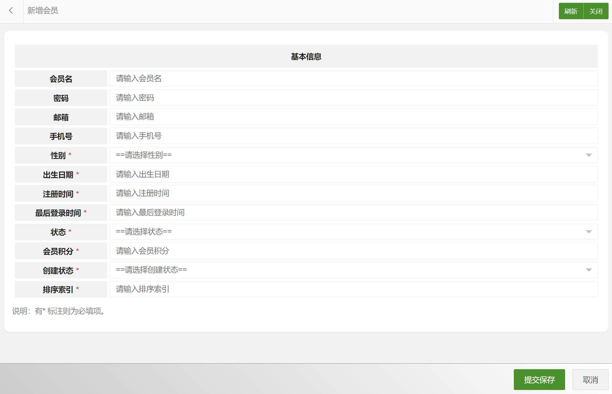 在会员列表中可以选择新增会员、编辑会员、删除会员、搜索会员等。会员属性包括:会员编码、会员名、密码、邮箱、手机号、性别、出生日期、注册时间、最后登录时间、状态、会员积分等。新增会员界面如图所示: