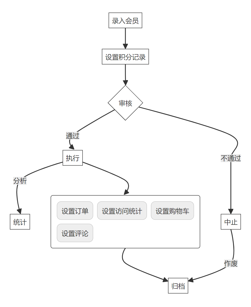 会员管理模块中涉及的主要角色包括普通员工和部门领导。普通员工负责录入、查阅及更新会员信息,具体功能如下:录入新会员(输入会员编码、姓名、密码、邮箱等);查看所有或特定条件下的会员详情;修改现有会员的部分字段如积分记录;删除不符合要求的会员记录。部门领导则承担数据审核与统计分析职责,主要活动包括验证普通员工提交的数据准确性及完整性,并根据需要进行批量调整操作(例如统一增加会员积分)。此模块还设计有权限管理机制确保不同角色只能访问并修改自己权限范围内的信息。整体而言,通过细致划分各角色功能以提升系统安全性与实用性是本项目中会员管理环节的核心目标之一。