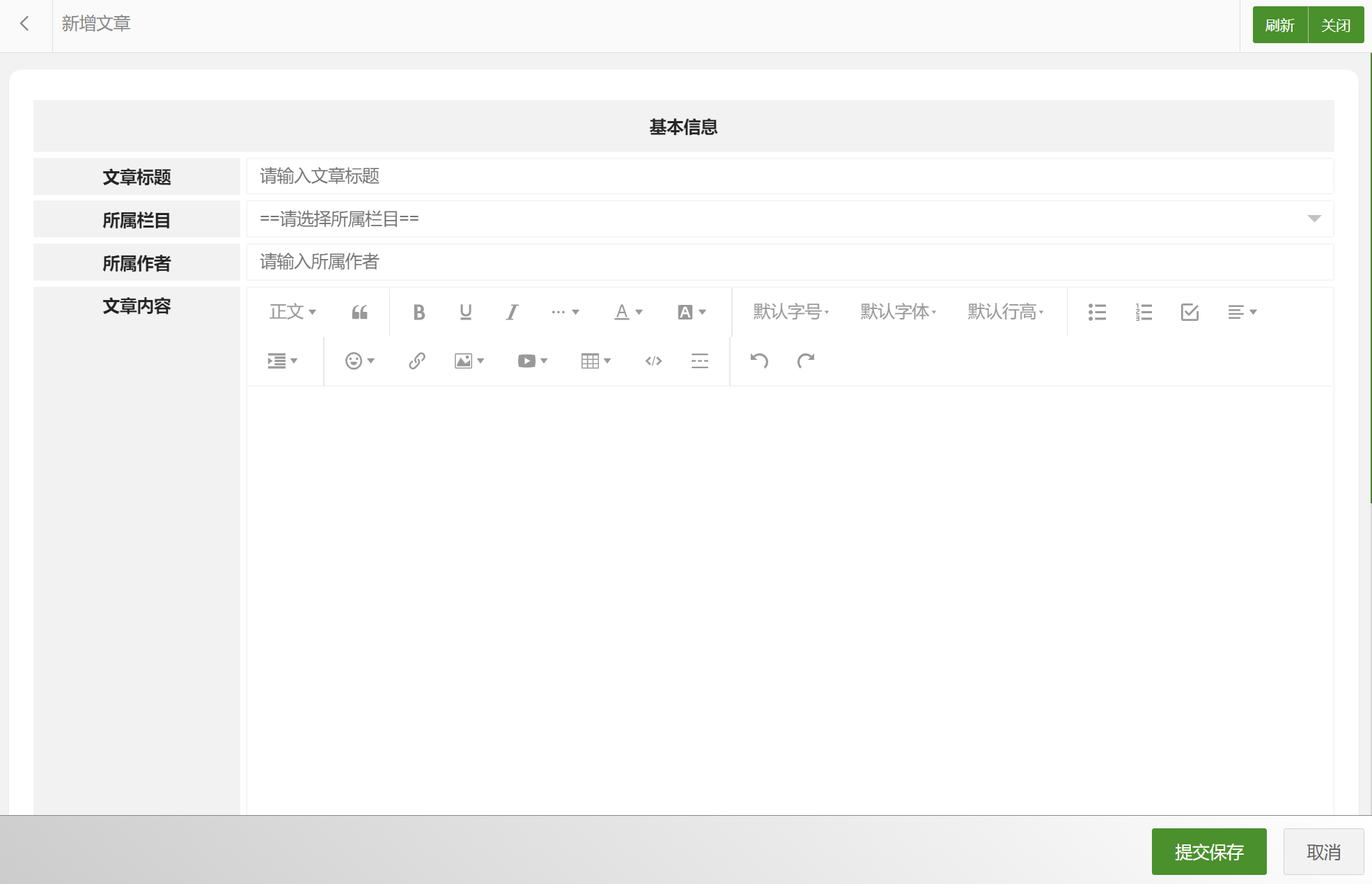 在文章列表中可以选择新增文章、编辑文章、删除文章、搜索文章等。文章属性包括:文章编码、文章标题、所属栏目、所属作者、文章内容、文章摘要、封面图片、发布时间、状态、浏览次数、评论次数等。新增文章界面如图所示: