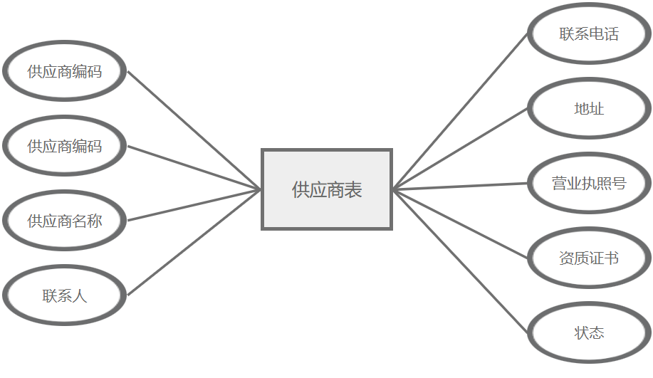 供应商管理主要属性包括:供应商编码、供应商编码、供应商名称、联系人、联系电话、地址、营业执照号、资质证书、状态。
